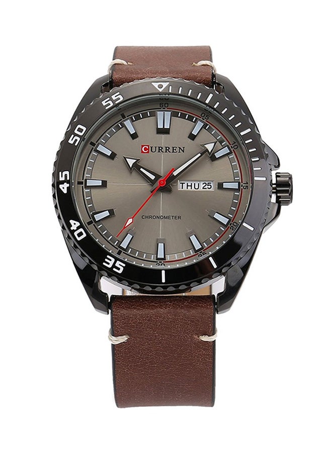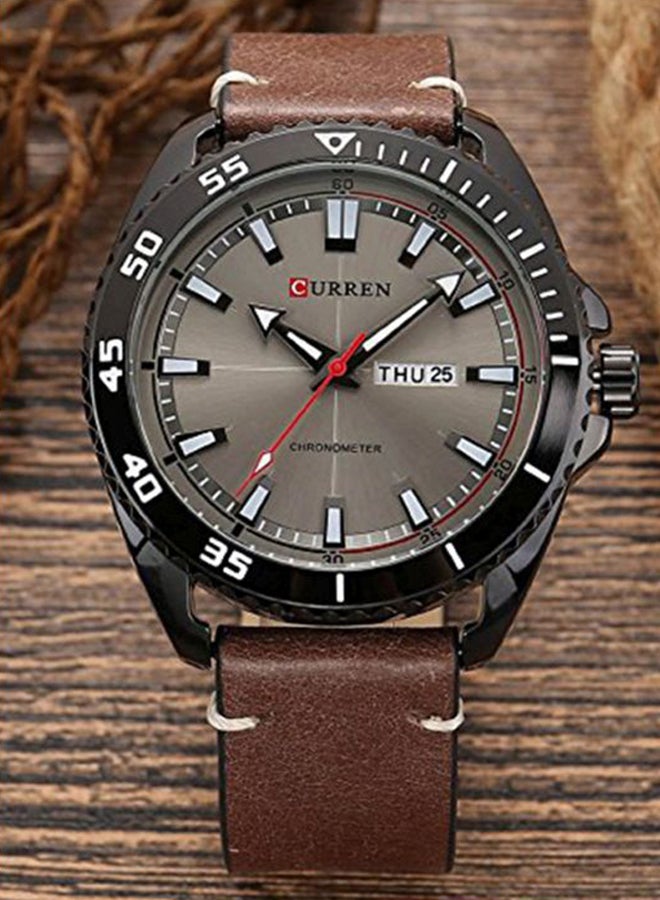 Classic men’s wristwatch featuring a rich brown leather strap and a sleek grey round dial for a timeless, everyday look.