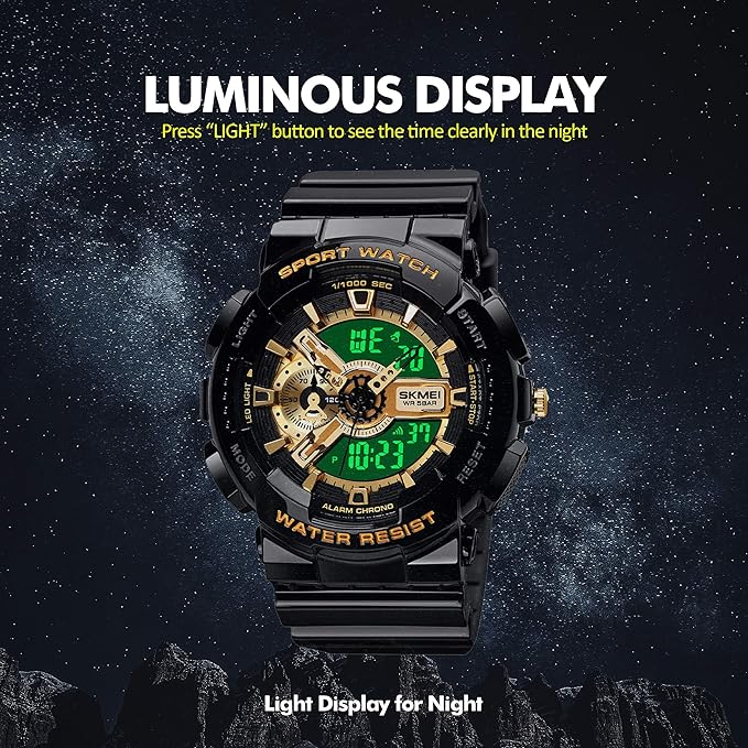 - SKMEI Watches for Men- Water and Shock Resistant- 3D Dial Double Movement LED Screen Large Face Stopwatch Alarm Wrist Watch, Gold, strap