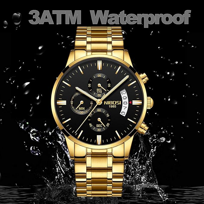 Product description Stay fashionable with Quartz watch from NIBOSI available on Amazon. This Chronograph watch has Round Black dial with a dial diameter of 42 mm The Gold colored straps in the watch are made of Stainless Steel Manufacturer Contact Information Vian International,