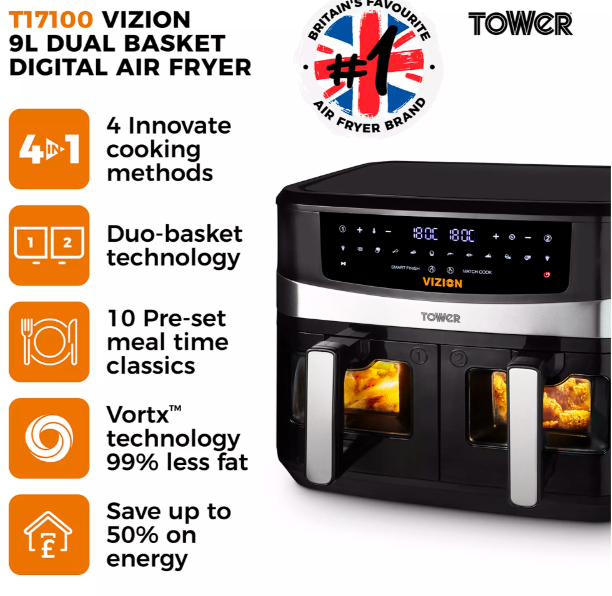 | 2600W 9L air fryer with dual 4.5L baskets to cook two dishes at once | Digital control panel with 10 Cooking preset options |